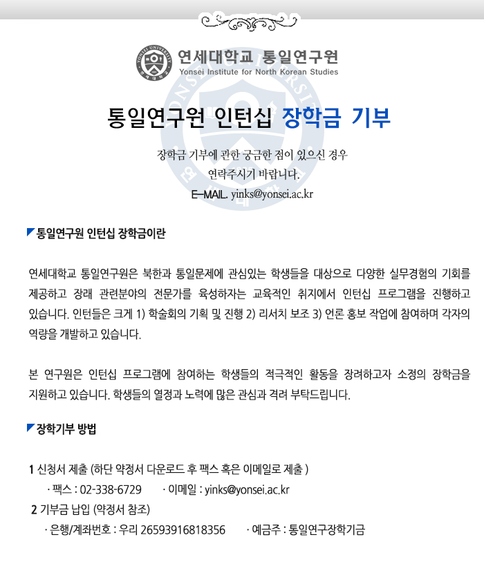 연세대학교 통일연구원 인턴십 장학금 기부연세대학교 통일연구원(공용/연세대학교 통일연구원) 2017년 2월 1일0분 분량[연세대학교 통일연구원]기부신청서(기관).docxDOCX 다운로드 • 55KB[연세대학교 통일연구원]기부신청서(기관).docxDOCX 다운로드 • 55KB